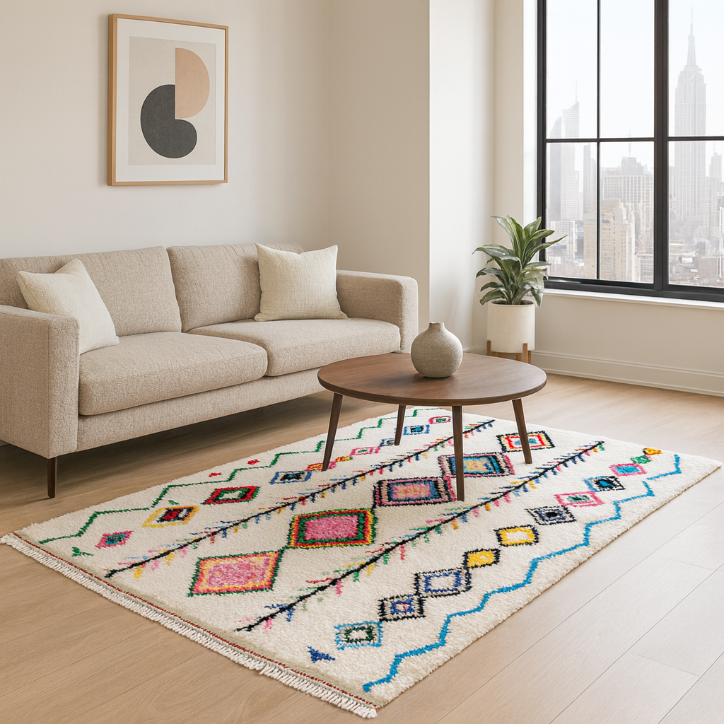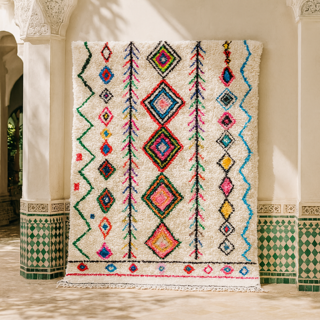 Nos tapis sont tissés à partir de laine 100% naturelle issue des moutons de l’Atlas marocain. Cette laine est reconnue pour sa douceur, sa résistance et sa capacité à conserver la chaleur. Elle est lavée et travaillée de manière artisanale, sans traitement chimique agressif.